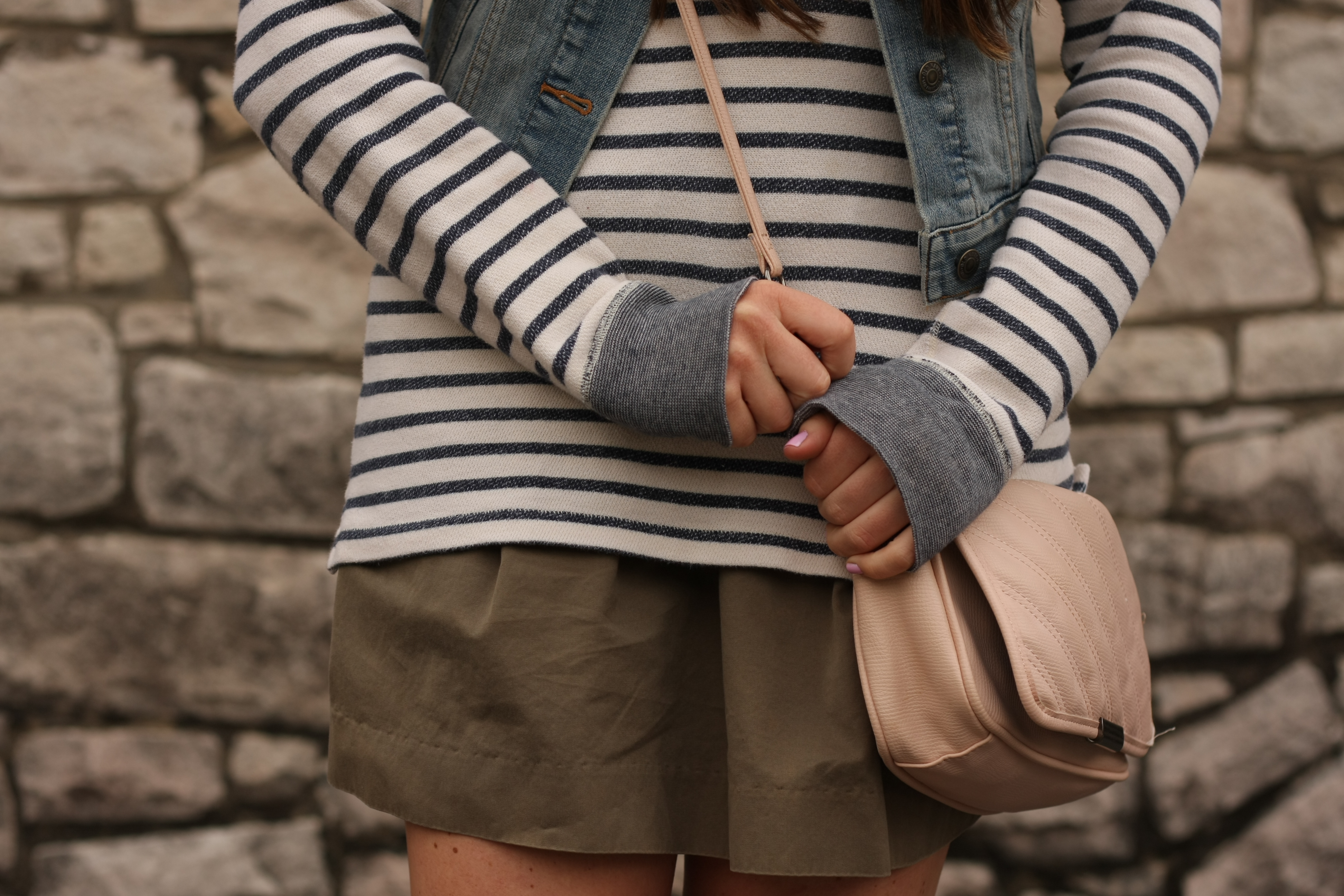 J.Crew skirt (very similar from J.Crew Factory) and Sweatshirt (love this one), Old Navy vest (very similar), Target purse, Rebecca Taylor shoes (last worn here), Gap sunglasses, Essie French Affair nails