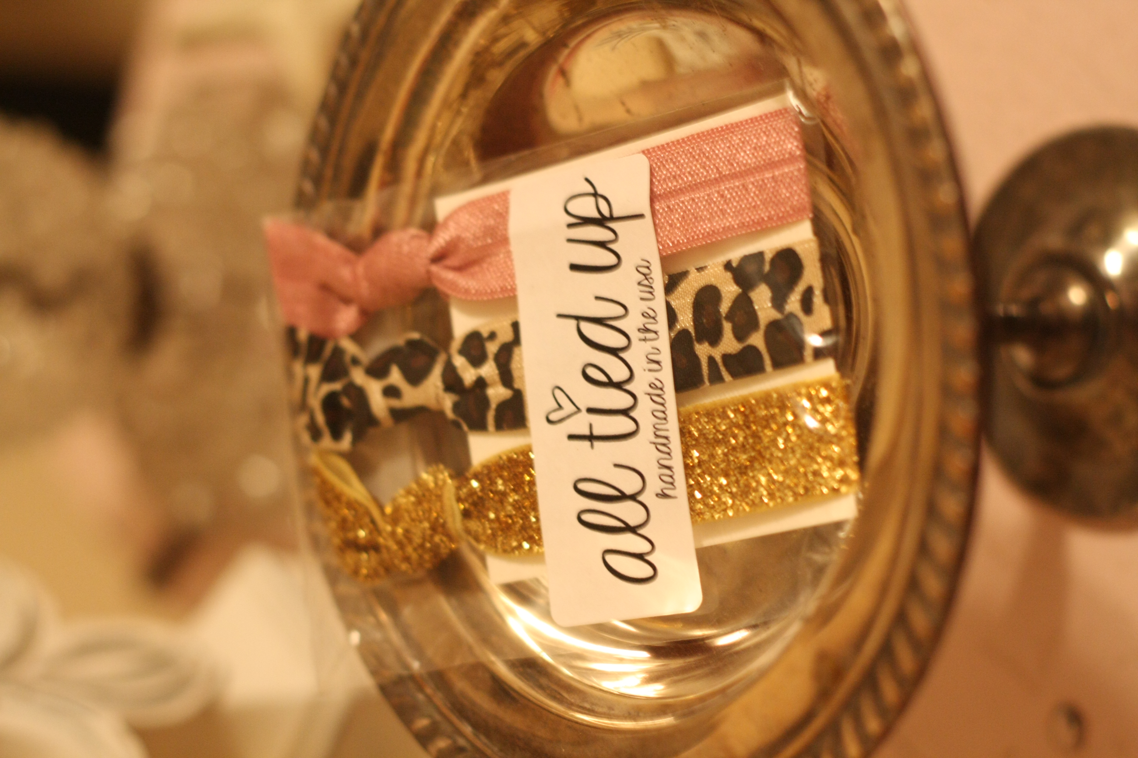 The colors I chose for the Pearls and Twirls collection were a pretty simple choice, gold glitter (love and wear all the time), leopard (because it’s a neutral, right?), and dusty rose (loving this muted shade of pink). One of my favorite things about All Tied up is that they double as hair ties and bracelets. They are perfect on the wrist to add to a bracelet stack and I love wearing them in my braids and side ponys.