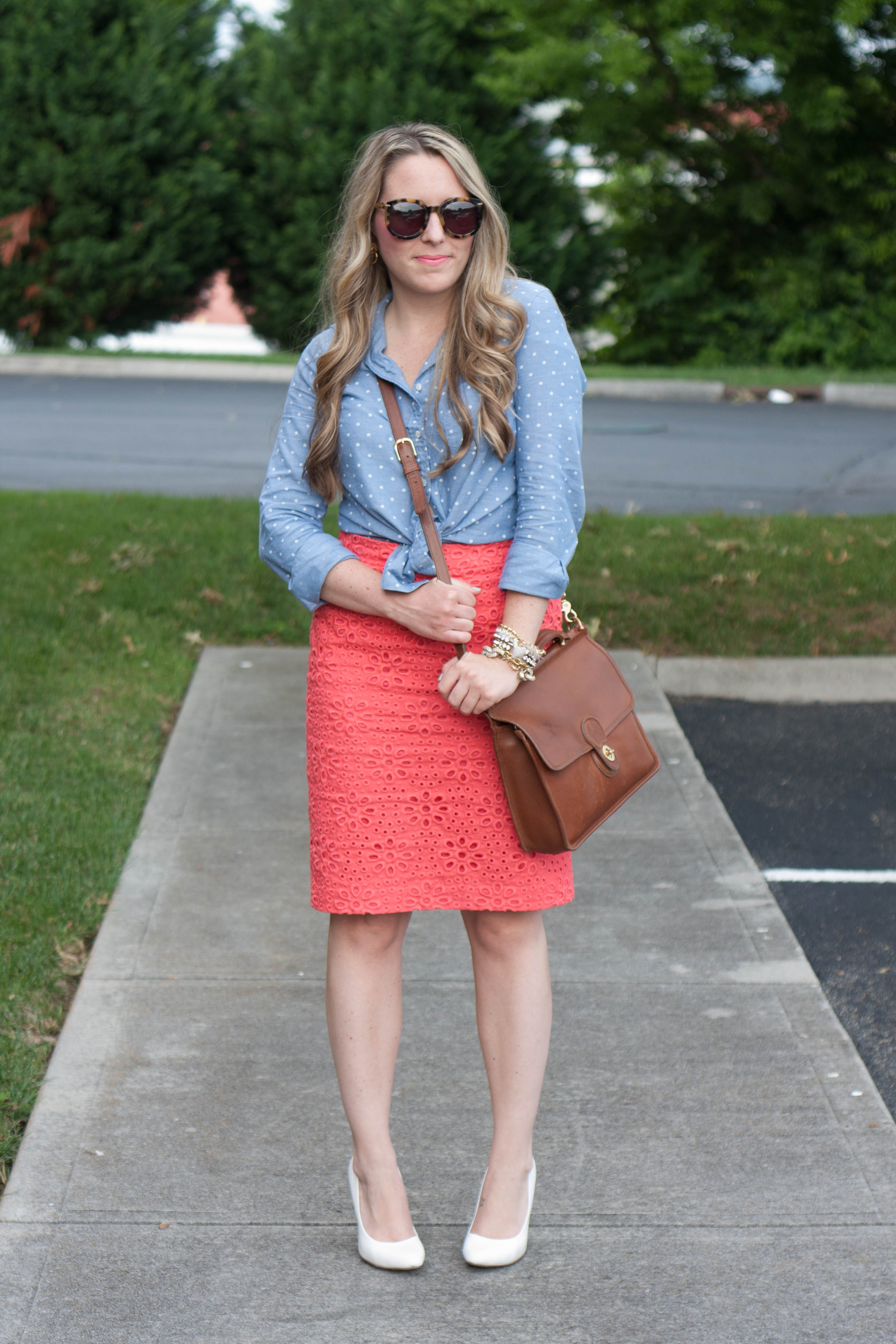 I swear I don’t have the right top for knot tying, mine always come out looking so stupid. I love yours! Plus that chambray print with the skirt is perfect!