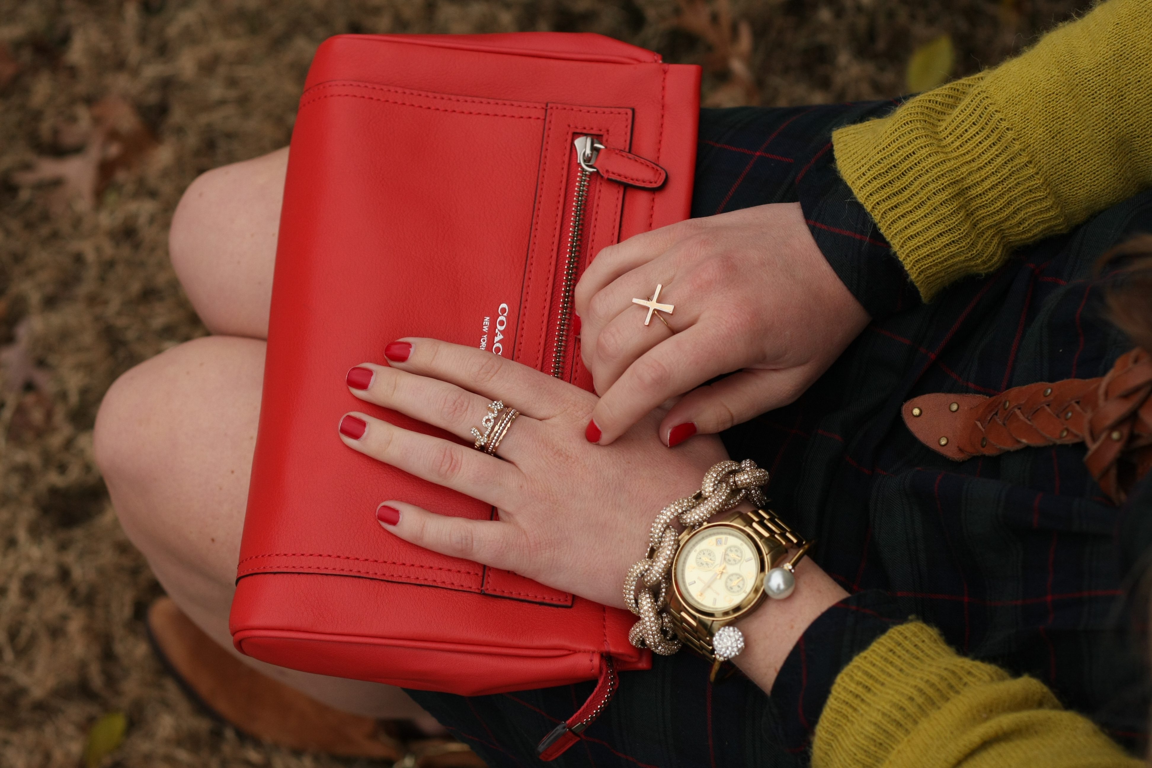 Gap shirtdress (sold out in the plaid but love this one!), J.Crew factory cardigan, J.Crew belt, Zara booties, Coach clutch, Michael Kors watch, J.Crew bracelet, Jewelmint and Lucky Staar rings