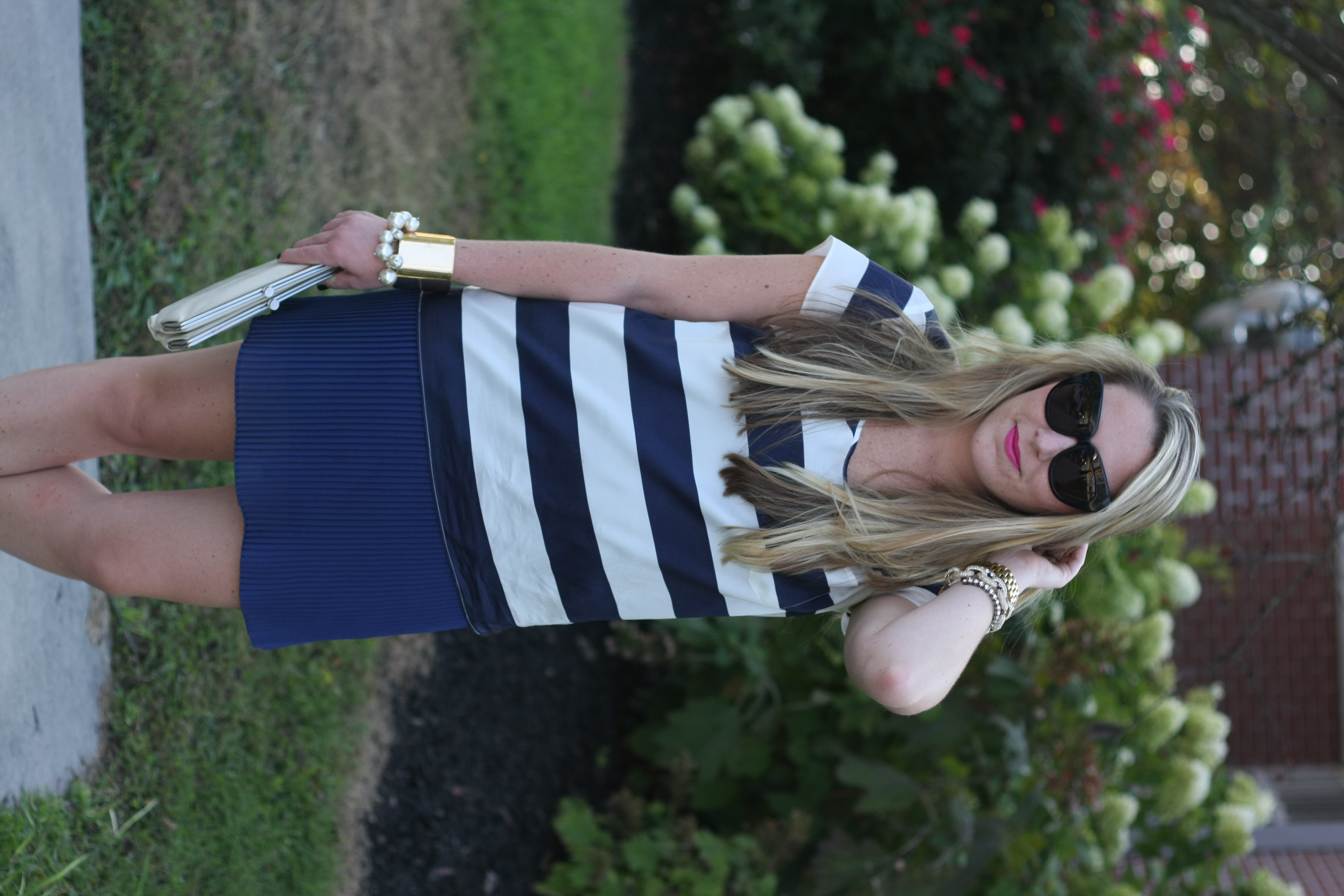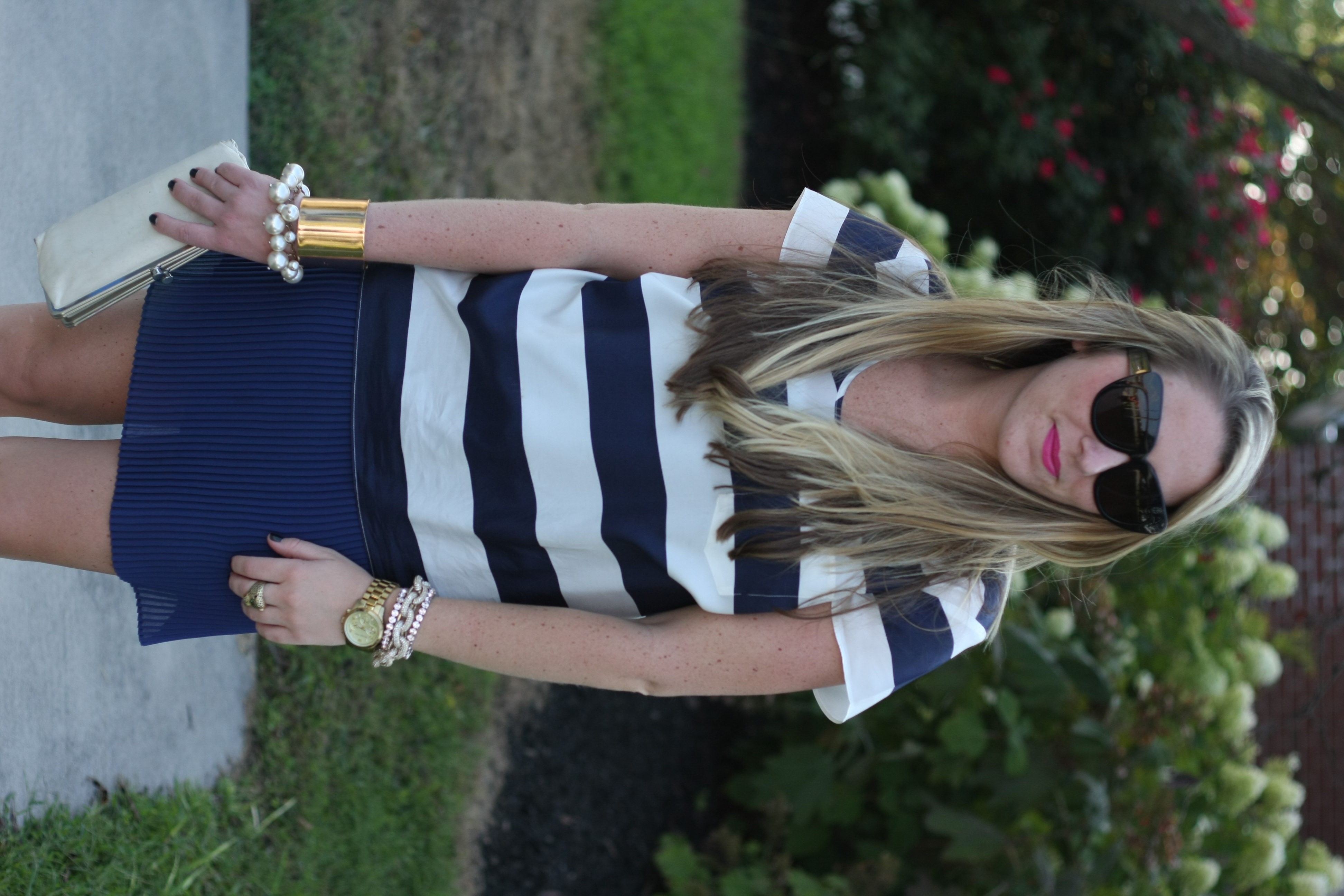 Parker dress (worn as a skirt, on SUPER sale – and last worn here), J.Crew factory top, Ann Taylor blazer, Target heels, Hobo clutch, Michael Kors watch, J.Crew link and other bracelets.