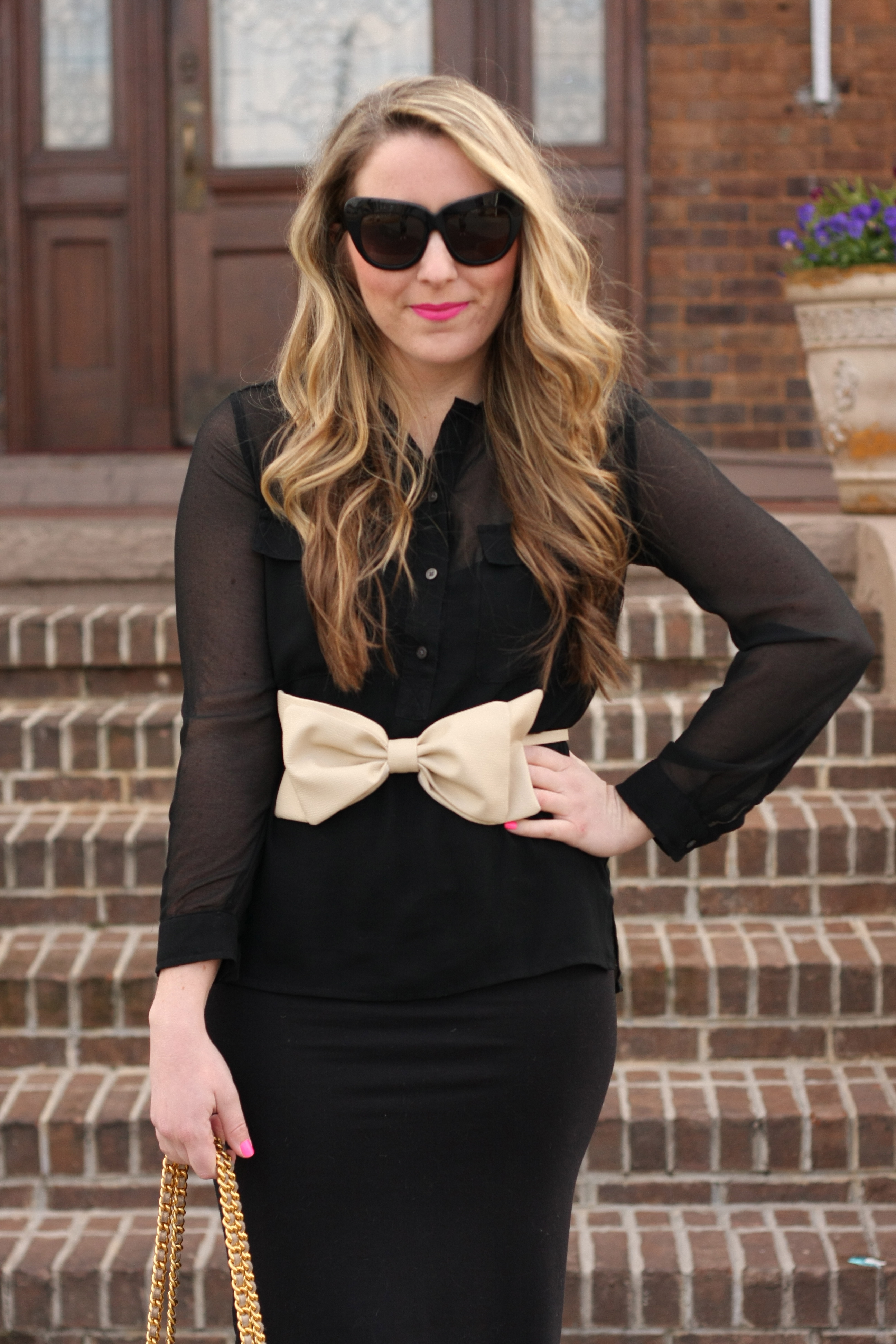 An all neutral look doesn’t show up much here on Pearls and Twirls. I got this adorable bow belt for Christmas and couldn’t wait to wear it! I love how the belt and all black also matched my new shoes perfectly! I’m definitely a color girl but love how an all neutral look can still be a lot of fun!