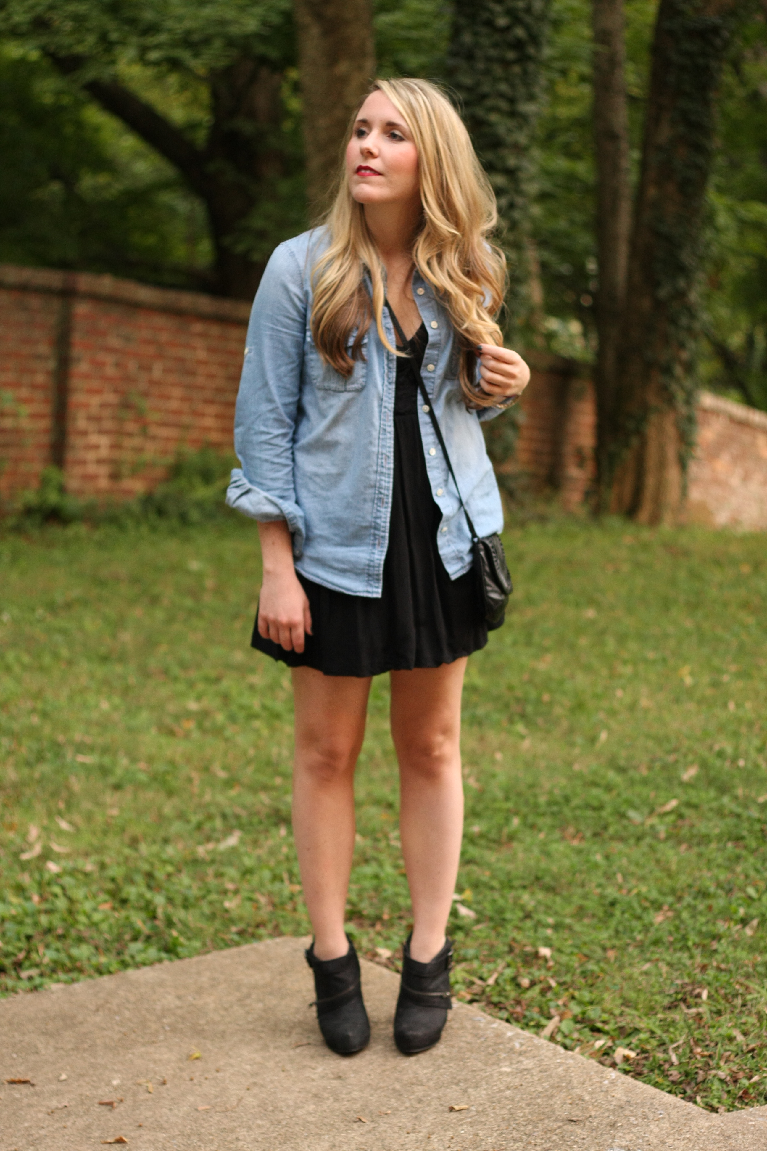Urban Outfitters dress (similar), J.Crew chambray shirt, H&M earrings, Aldo shoes, BaubleBar skull bracelet, vintage bangles, NARS Cruella lips