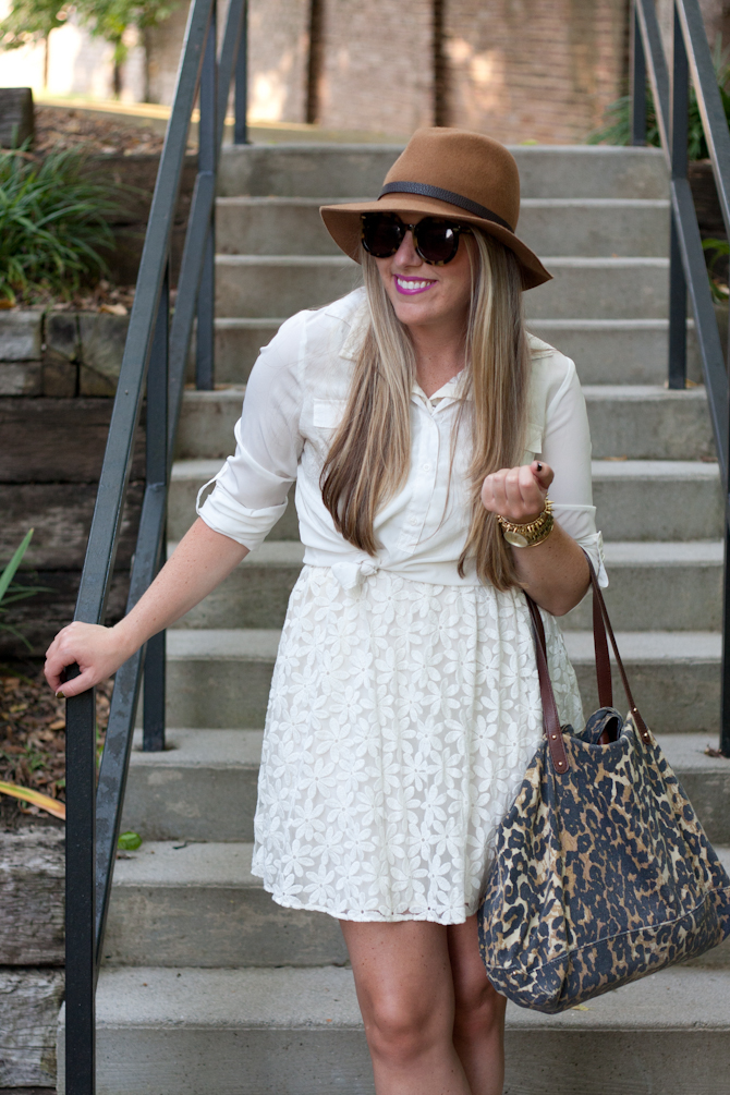As I mentioned yesterday I’m really loving a good winter white look for fall and winter. I took an old Forever 21 lace dress, layered a easy white top and added some fall accessories and you barely even notice this is a summer dress. The goal for wearing white for fall and winter is to look like you’re still dressing appropriately for the current season so play around with accessories and layers to find your perfect look. Anyone else wearing white this fall?