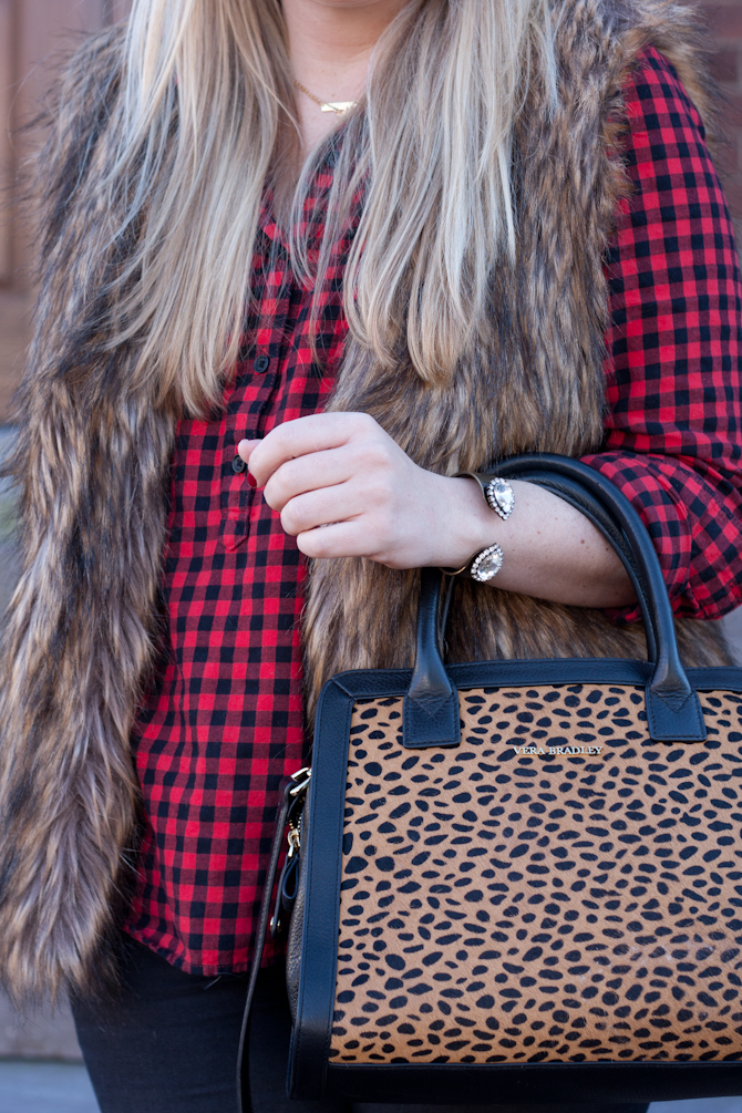 Old Navy top (30% off site wide & 40% off $75 or more!!) | My Kind of Lovely fur vest | Old Navy jeans (30% off site wide & 40% off $75 or more!!) | gifted Vera Bradley bag | My Kind of Lovely boots | Loren Hope bracelet | gifted & rented Prada sunglasses via Shop Ditto (Rent your first pair free with code PEARLSANDTWIRLS)